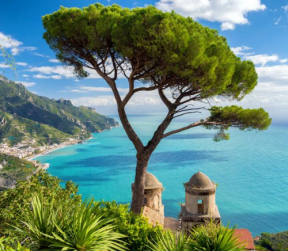 In cima ad una altura, a circa 365m sul livello del mare, si trova il paese di Ravello, affacciato sul golfo di Salerno ed a breve distanza in auto ed a est di Amalfi. Questo luogo incantevole ospita giardini ombreggiati e vicoli tranquilli, e gode di un ritmo di vita più lento che negli anni è riuscito a sedurre chiunque, da Wagner a D.H. Lawrence e Gore Vidal. Tra le gemme di Ravello spicca la maestosa Villa Cimbrone i cui giardini costituiscono l'attrazione principale essendo considerati uno degli esempi più importanti di architettuta paesaggistica in stile inglese del sud Europa.